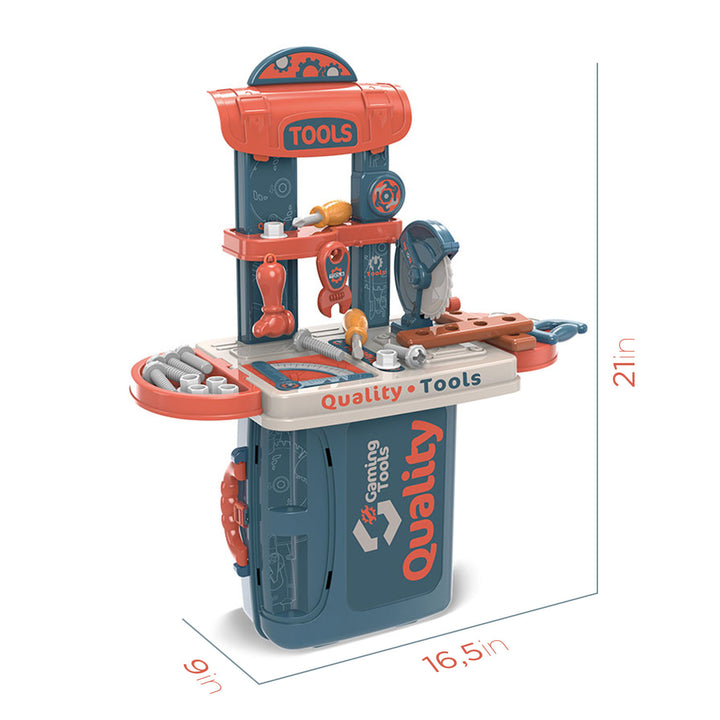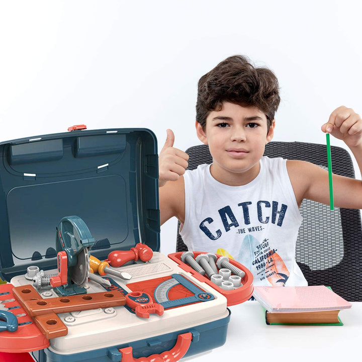 - PORTABLE AND EASY TO CARRY – Our portable workbench can be easily dismantled and organized into a suitcase. This makes carrying the construction tool toy set super easy and convenient for your kids wherever they go. What’s more, the suitcase itself occupies a small space.